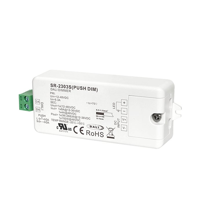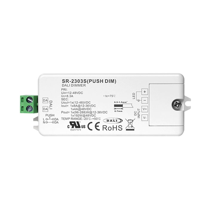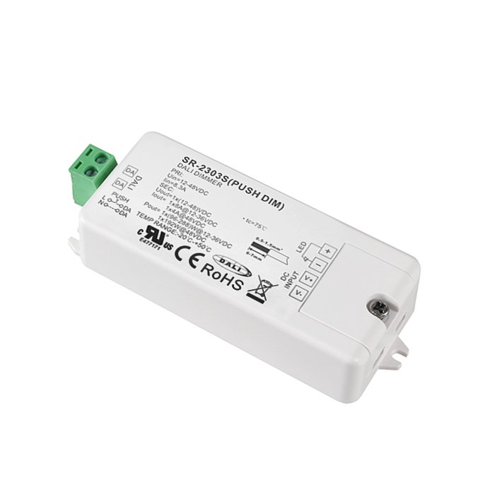 DALI-2 stmievač s označením SR-2303S-PUSH-DIM je ideálne riešenie pre moderné a efektívne riadenie osvetlenia jednofarebných LED pásikov pomocou DALI-2 protokolu (spätne kompatibilné s DALI). Umožňuje pripojenie bežne dostupných tlačidlových vypinačov pomocou PUSH-DIM zbernice alebo integráciu do systémov automatizácie budov pomocou DALI-2 protokolu za účelom precízneho a plynulého stmievania jednofarebných LED pásikov: