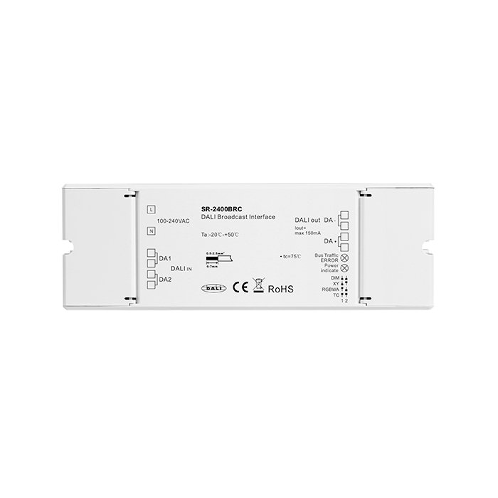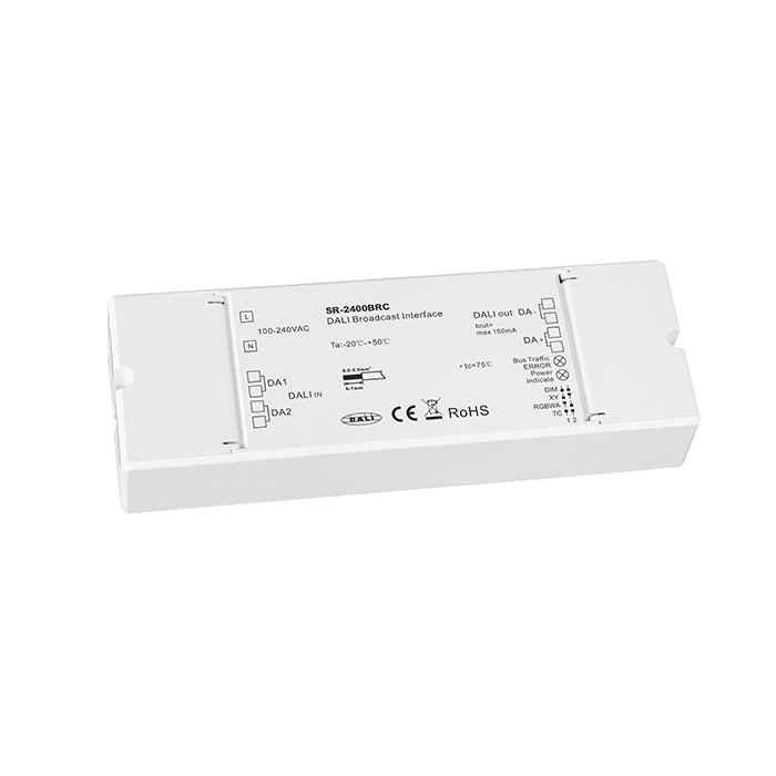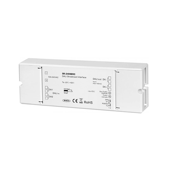 DALI Broadcast modul s označením SR-2400BRC je špičkový elektronický produkt pre rozšírenie DALI systémov (Digital Addressable Lighting Interface). Umožňuje efektívne riadenie až 64 pripojených DALI zariadení prostredníctvom jedinej DALI adresy priradenej jednotke Broadcast. Riadiace signály sú vysielané k všetkým pripojeným zariadeniam, čo zaisťuje synchronizované ovládanie bez nutnosti individuálnej adresácie jednotlivých prvkov. Vďaka týmto vlastnostiam výrazne zjednodušuje konfiguráciu zariadení so zhodnou funkcionalitou a umožňuje rozšírenie DALI systémov až na 4096 pripojených zariadení.
