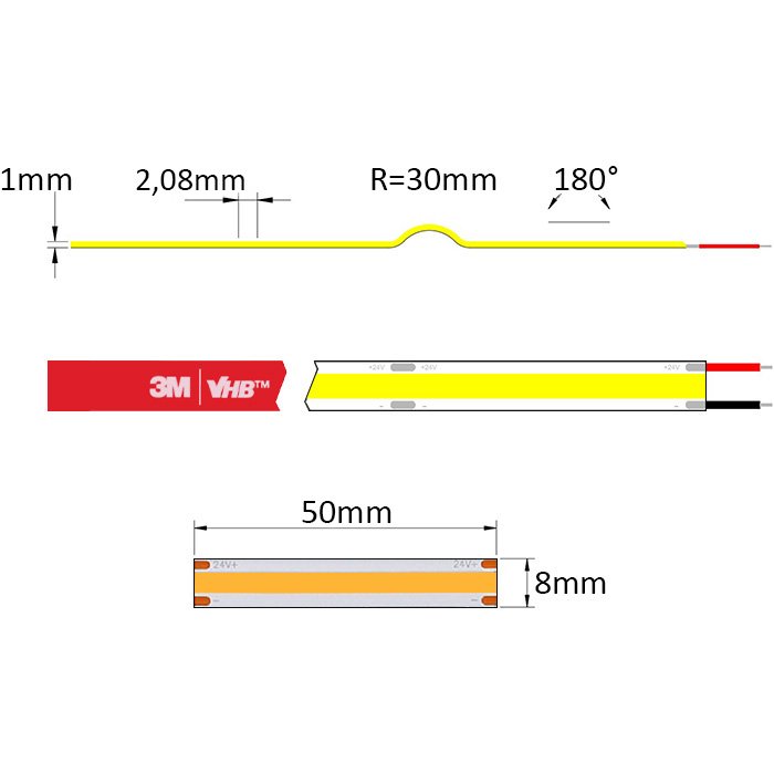 Na spodnej strane COB LED pásika - COB-SC24480 nájdete obojstrannú lepiacu pásku najvyššej rady 3M VHB. Tá zaistí vynikajúcu priľnavosť k hliníkovému povrchu, ktorý je typický pre LED profily. Použitie LED profilu pre inštaláciu LED pásika odporúčame ako jedinú a správnu možnosť.