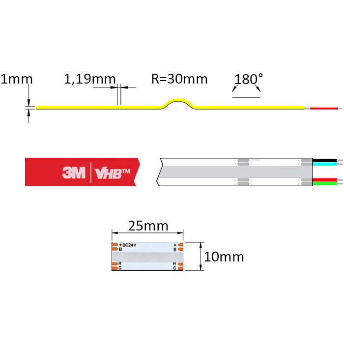 Dôkladne bol vybraný aj podkladový materiál a štruktúra. COB 24V RGB LED pásik s označením COB-RGB24840 je postavený na tlačenom spoji PCB (Printed Circuit Board) so šírkou 10mm, deliteľnosťou každých 2,5cm a podielom medi 2OZ.