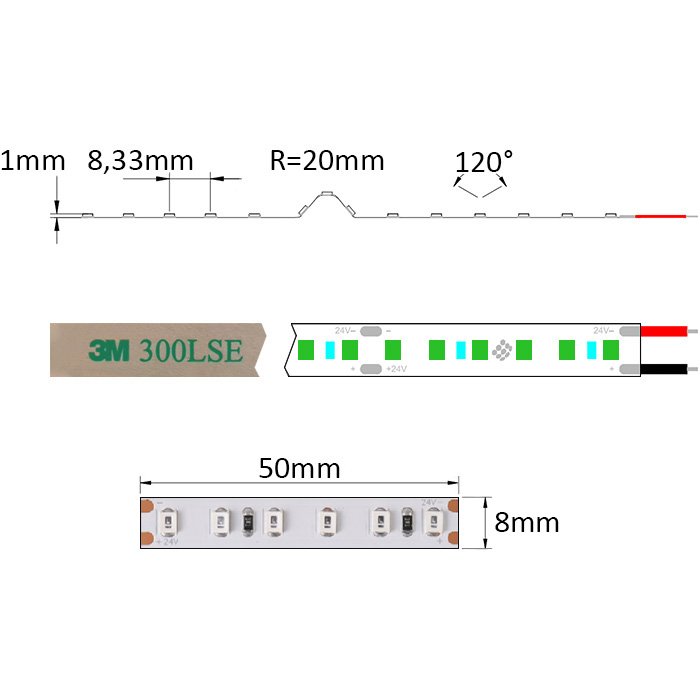 Dôkladne bol vybraný aj podkladový materiál a štruktúra. 24V LED pásik s označením SC24120 je postavený na tlačenom spoji PCB (Printed Circuit Board) so šírkou 8mm, deliteľnosťou každých 5cm a podielom medi 2OZ.