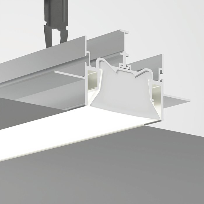 - LED profil je nutné zabudovať do sadrokartónového podhľadu pri jeho stavbe - kompatibilný je sadrokartónovými doskami 12,5 mm.