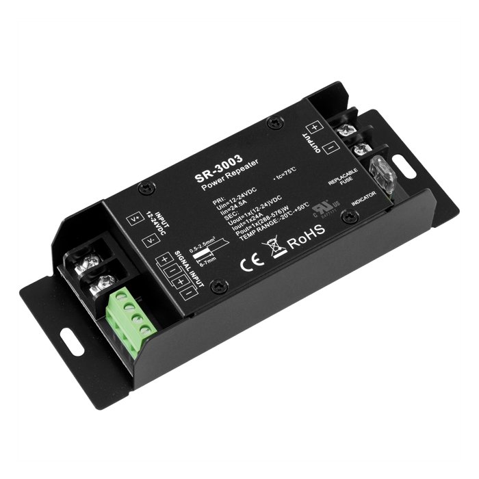 Zosilovač riadiaceho signálu pre LED pásiky a svietiace ohybné pásiky s označením SR-3003 je dôležitou elektronickou jednotkou najmä v rozsiahlych projektoch osvetlenia. Využíva sa v situáciách, keď potrebujete ovládať väčší príkon LED pásikov, než umožňuje kapacita jedného stmievača. Zosilovač LED signálu SR-3003 zaisťuje, že všetky pripojené pásiky reagujú jednotne na riadiaci signál stmievača, či už ide o zmenu intenzity svetla, farby alebo zapnutie a vypnutie osvetlenia.