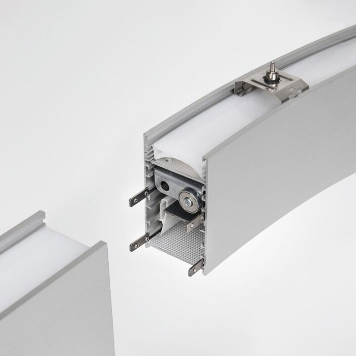 Oblúkové LED svietidlo KLUŚ SERPENT R-PLUS NT 1/4 s polomerom r=750mm môže byť použité ako samostatné prisadené svietidlo alebo ako súčasť systému osvetlenia pre výrobu individuálnych svietidiel polygonálnych tvarov. Poskytuje vysokú svetelnú účinnosť s hodnotou CRI90+ pre verné podanie farieb, minimalistický dizajn a profi produktové spracovanie zaisťujúce dlhú životnosť. Použité materiály s nízkou uhlíkovou stopou sú šetrne k životnému prostrediu a pomáhajú vytvárať udržateľné stavby. Vďaka vysokej modularite je tento systém ideálny pre rozsiahle projekty, kde je potrebné rešpektovať individuálne požiadavky na dĺžku, tvar alebo rozmiestnenie svetelných zdrojov.