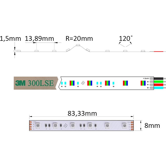Dôkladne bol vybraný aj podkladový materiál a štruktúra. 24V LED pásik s označením RGB2472 je postavený na tlačenom spoji PCB (Printed Circuit Board) so šírkou 8mm, deliteľnosťou každých 83,33mm a podielom medi 3OZ. Vysoký podiel medi 3OZ pri výrobe zaisťuje pre LED pásik 24V: